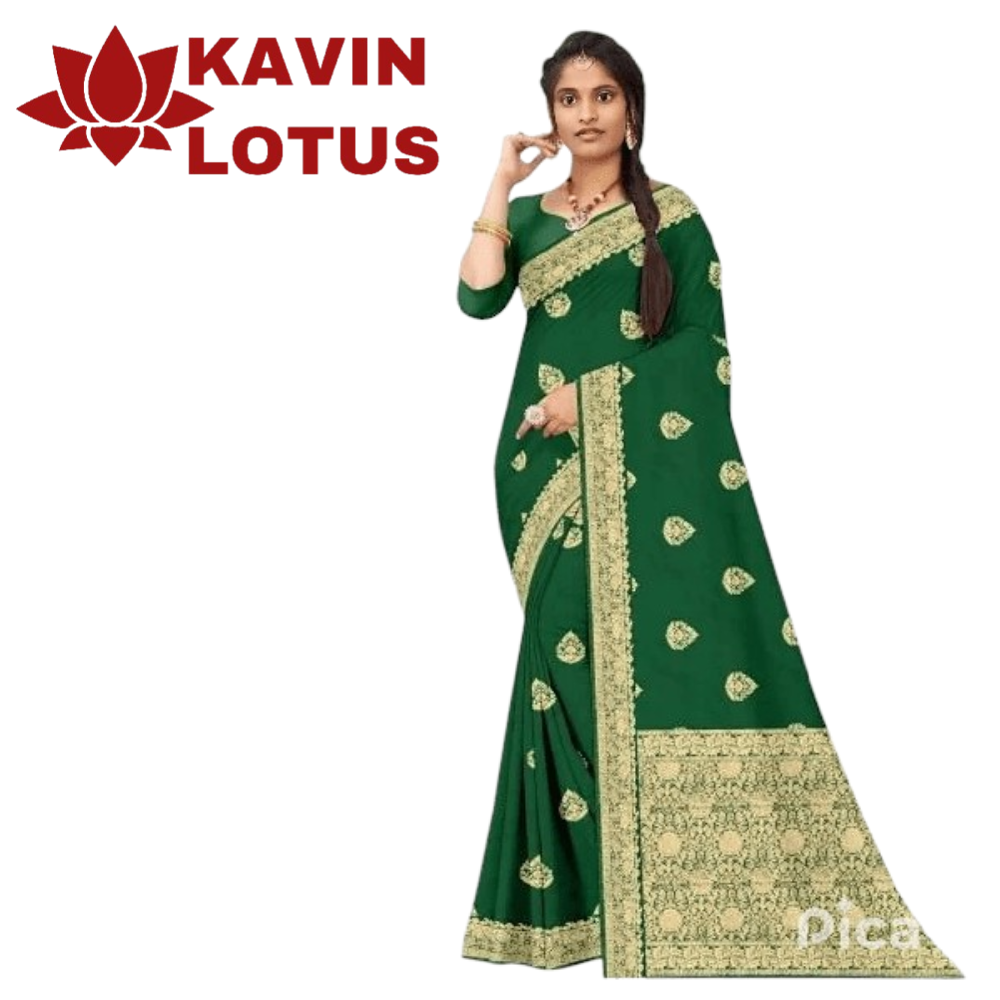 This stunning saree comes in a rich emerald green color, beautifully adorned with golden embroidered motifs throughout. The saree features: